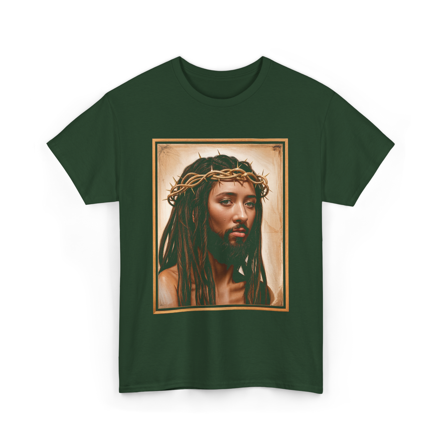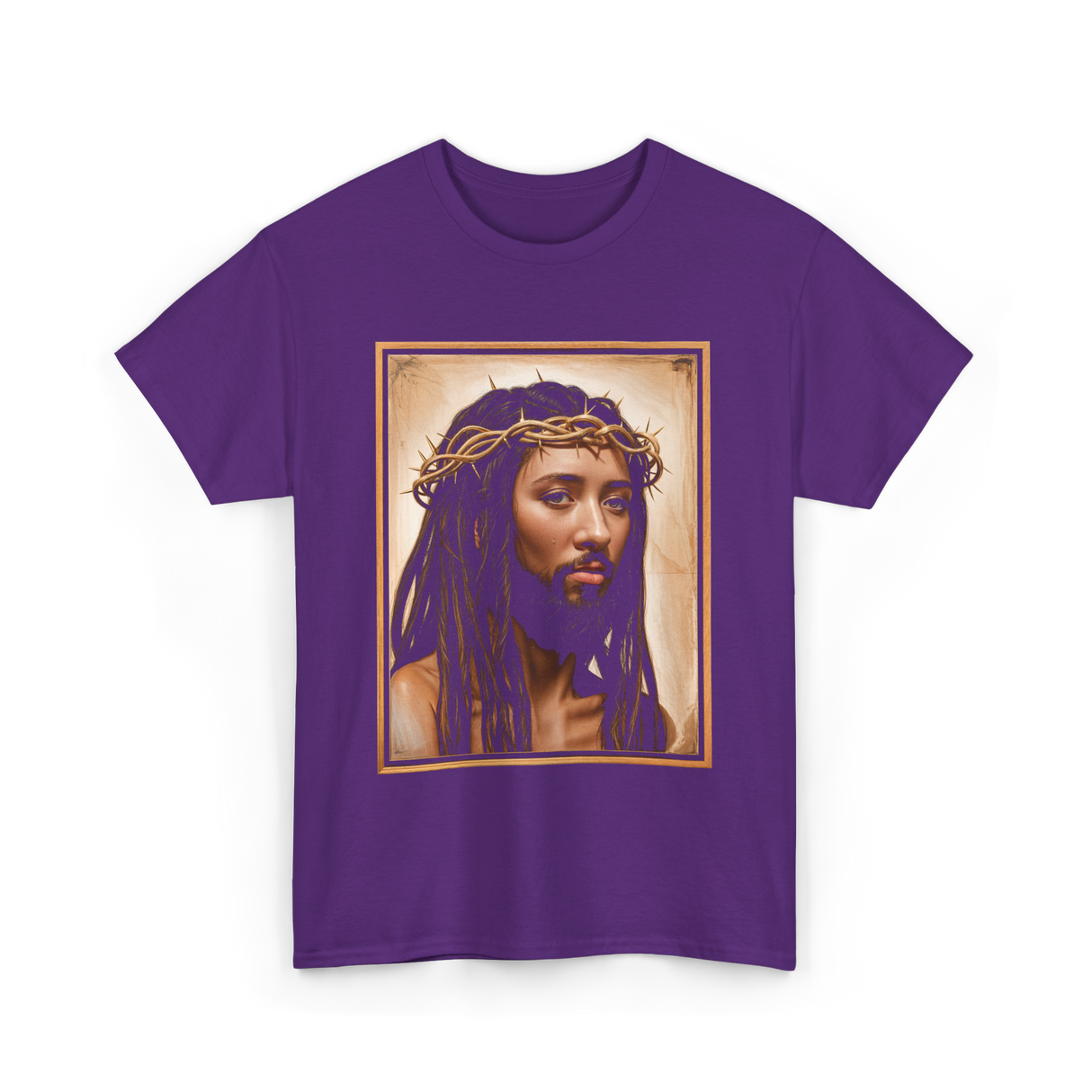 This striking design features an artistic portrayal of Jesus with long hair and a crown of thorns. The imagery conveys deep religious significance, making it ideal for those who appreciate spiritual art. This artwork resonates with communities centered around faith, devotion, and cultural heritage, perfect for individuals who seek to express their beliefs and connect with their spirituality. The detailed depiction invites reflection and admiration, captivating audiences drawn to religious themes.