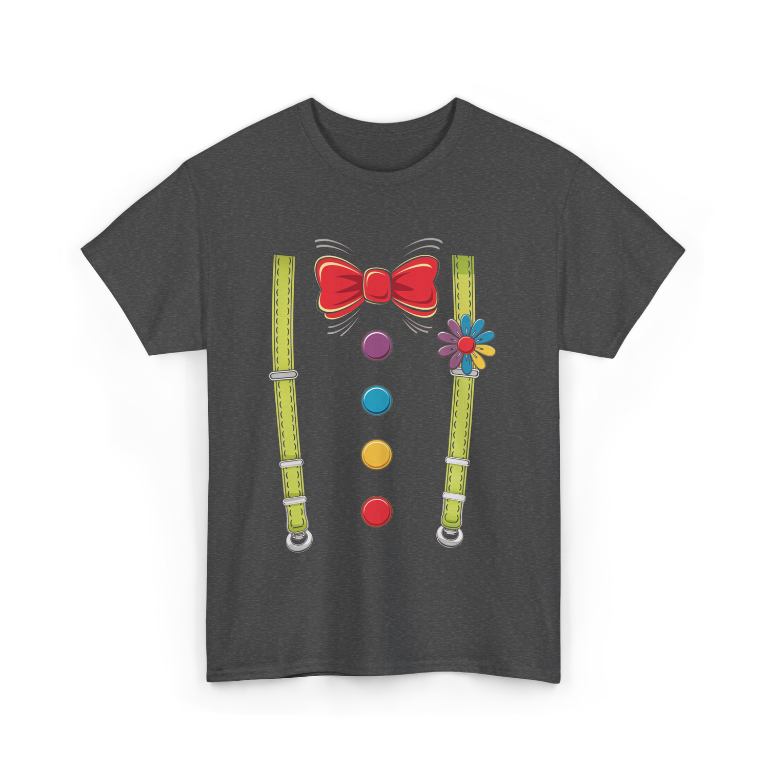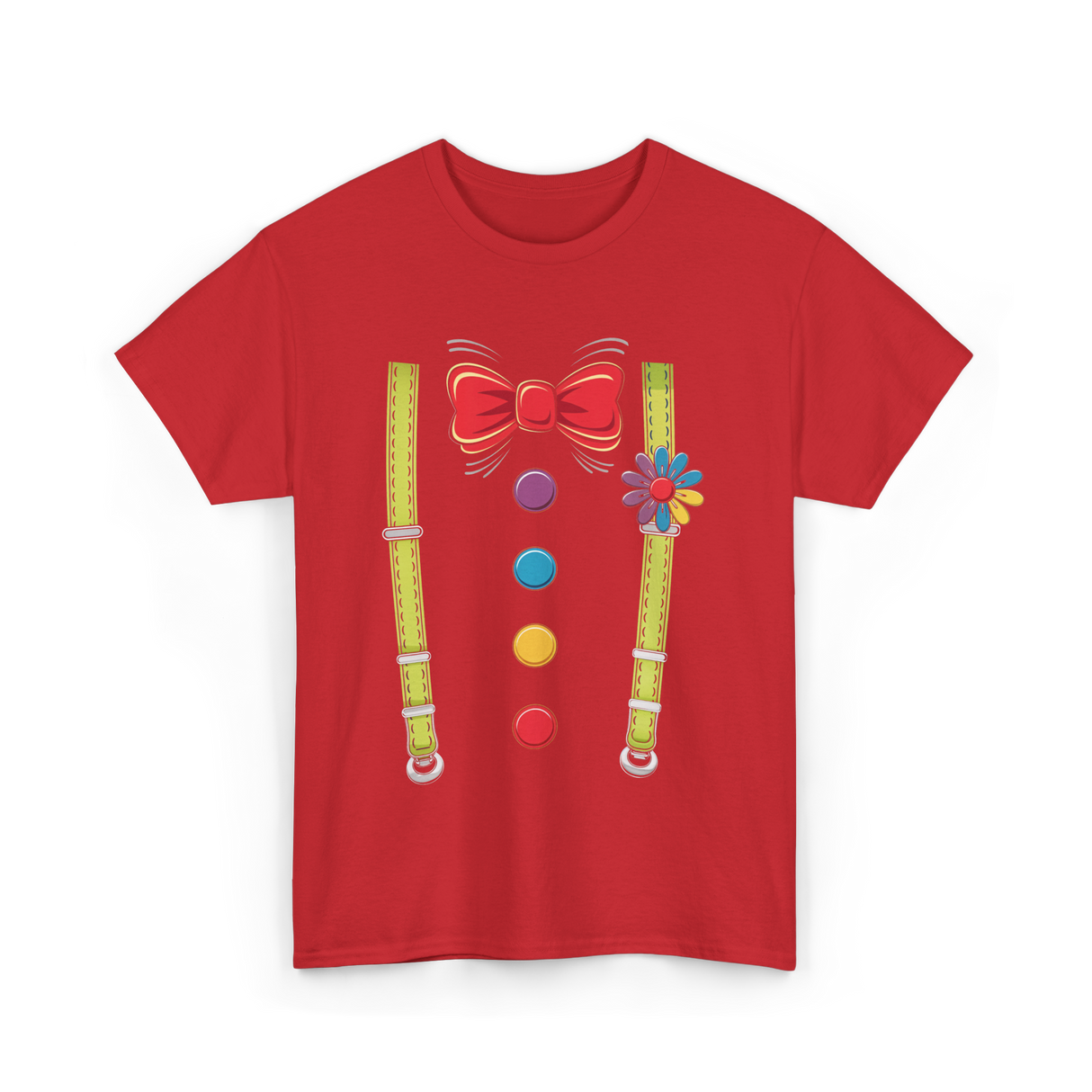 Bright and playful design featuring a red bow tie and colorful buttons against a black background. This cheerful design is ideal for those who love whimsical art, clowns, or playful motifs. Perfect for children and adults alike who appreciate fun and creative illustrations. The vibrant colors of the suspenders and buttons add a charming touch, making it suitable for parties, costume events, or everyday wear.