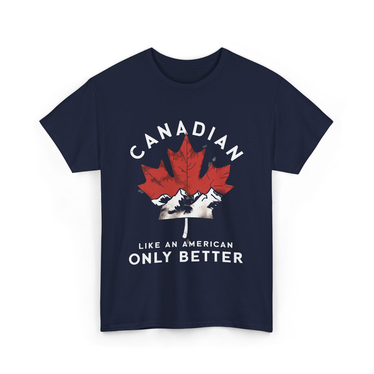 Show your pride in being Canadian with this unique design featuring the iconic maple leaf and mountains. The text 'Canadian Like An American Only Better' captures the essence of Canadian identity and culture. Ideal for Canadians and those who appreciate the country's beauty and spirit. Perfect for men and women who celebrate their heritage or just love Canada.