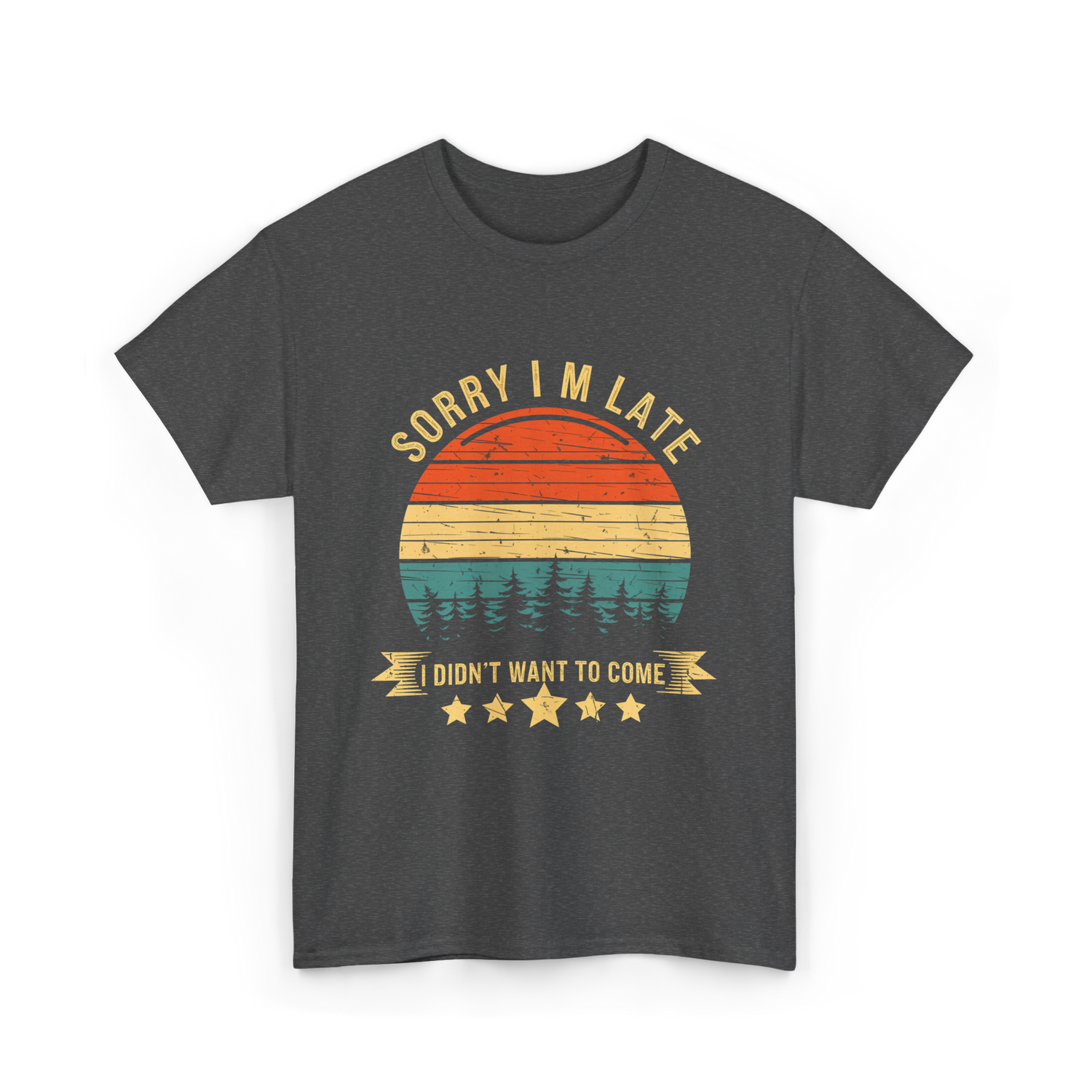 Express a laid-back attitude with this unique design featuring the text 'Sorry I'm Late I Didn't Want to Come'. Perfect for those who prefer to skip social events without the need for excuses, this design resonates with free spirits and introverts. The retro vibe of the illustrated sunset provides a touch of nostalgia, making it appealing to a broad audience. Ideal for casual outings, gatherings, or simply as a way to showcase personality.