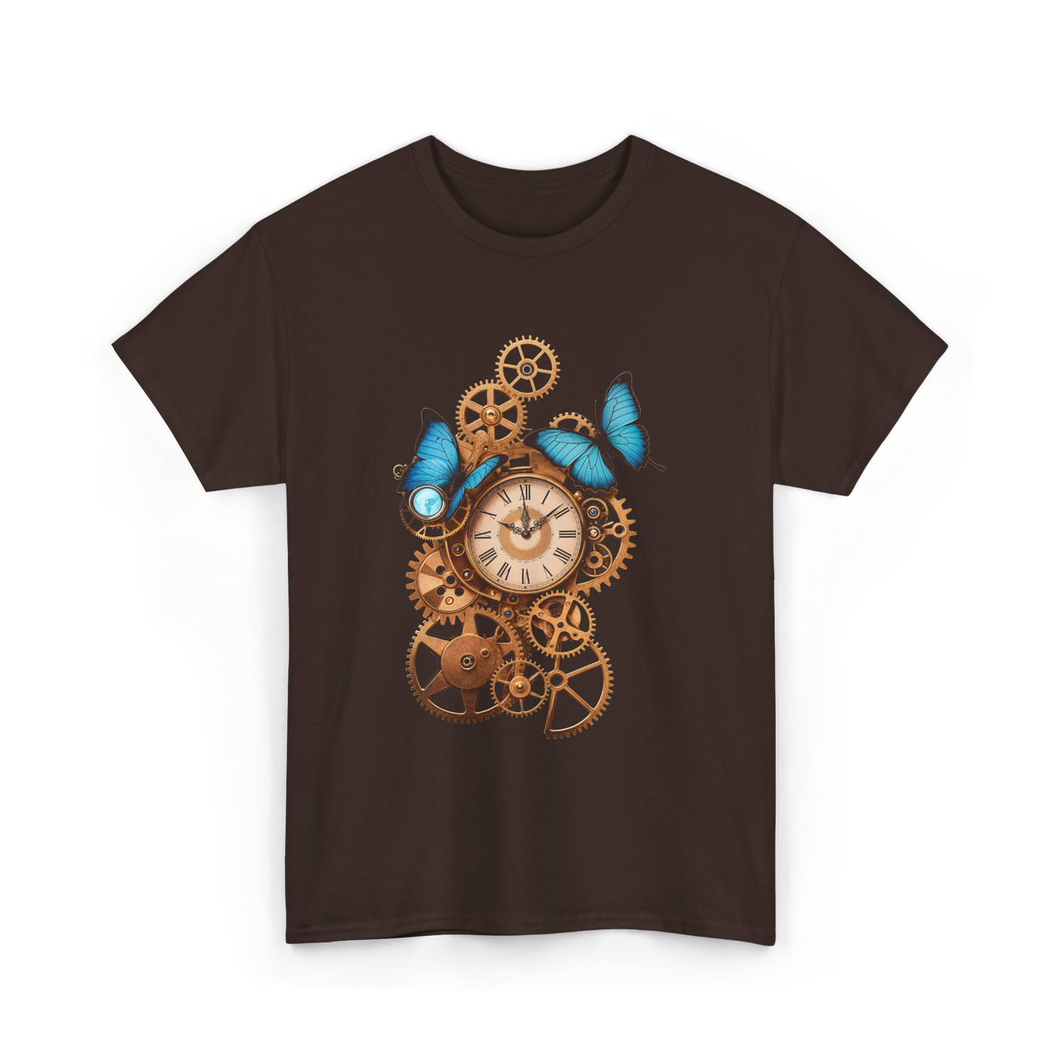 Dive into a world of elegance with this captivating steampunk design featuring intricate clock gears and beautiful blue butterflies. This unique artwork combines vintage aesthetics with a mechanical flair, appealing to fans of retro style and steampunk culture. Perfect for enthusiasts of clockwork mechanics, vintage decor, and bold artistic expressions. The beautiful blue butterflies add a touch of nature to the intricate metallic design, creating a stunning visual contrast that attracts attention.