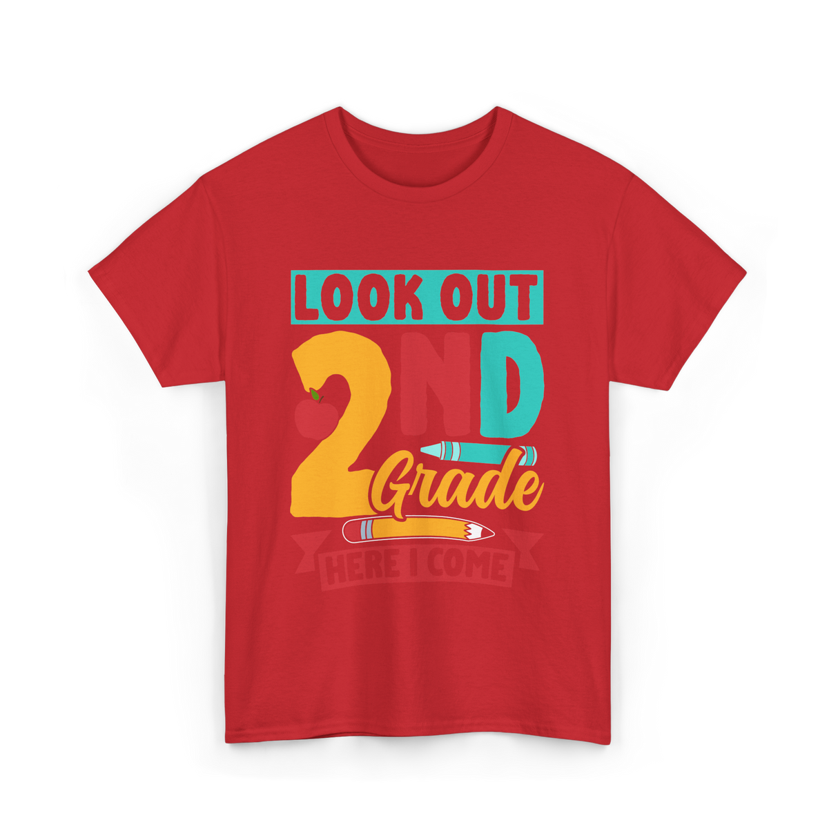 This vibrant design features the phrase 'Look Out 2Nd Grade Here I Come,' perfect for excited students ready to start a new school year. The colorful elements, including an apple and school supplies, make this ideal for children entering second grade. It's a great way to celebrate the spirit of learning and enthusiasm for education, resonating with both kids and parents in the back-to-school season.